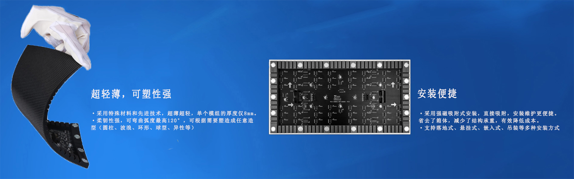 LED無縫拼接軟屏也稱作柔性LED顯示屏,軟模組、柔韌好、任意可彎曲,安裝可以是任意曲面,適合藝術(shù)造型;采用特殊材料和先進(jìn)技術(shù),超薄超輕,單個模組的厚度僅8mm,不僅輕薄,可塑性強(qiáng),該系列LED軟模組屬于異形LED大屏,采用可彎曲pcb和硅膠底殼套件,柔韌性強(qiáng),可彎曲弧度最高120°低電流,低熱量,高對比度,高亮高灰,刷新1920Hz,真16bit灰度等級,搭配SMD1515純黑燈,黑屏整屏暮色完全一致,像素吻合1920*1152/3840*2304,2K/4K分辨率,播放高清視頻,達(dá)到最完美播放效果。(適用于圓柱屏、波浪屏、環(huán)形屏、球型屏、彩帶屏弧形屏等顯示場合)